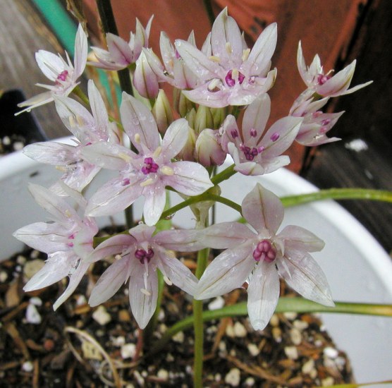 Allium glandulosum Link & Otto is a Mexican species that blooms in late summer and autumn with dark, metallic red flowers. Height: to about 30 cm. The plant shown here in the first three photos from Mark McDonough was originally collected in central Mexico at high elevation in swampy soil. It was difficult to photograph well. The first two show the true red flowers close up, the third an entire potted plant. The last photo by Wietse Mellema.