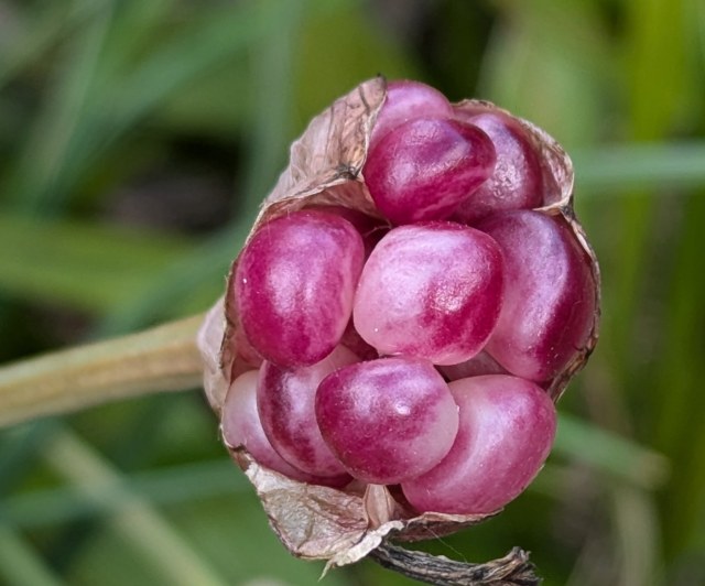 Amaryllis seeds also vary from dark pink to white, as shown by the photos below. They can also be variously veined and mottled. The seed color doesn't necessarily predict the flower color, though -- pink seeds turn darker when exposed to sunlight. Pure white seeds do seem to be associated with white flowers, although we haven't heard of a controlled test of that. The first photo from Michael Mace and the second of a fruit with seeds from Laura Grant.