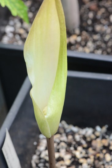 Amorphophallus krausei Engl. is a herbaceous, perennial plant producing a solitary leaf about 25 cm long from a tuberous rootstock. Photograph from Arnold Trachtenberg.