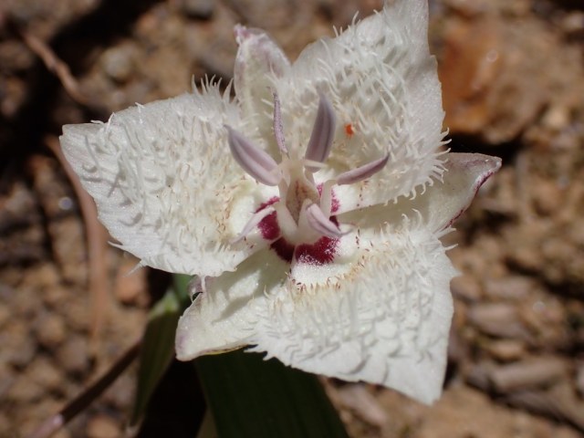 Calochortus vestae (Purdy) Wallace is a large flowered, North Coast (California) range species with a common name of the Goddess Mariposa. This species increases by bulbils and likes a lot of water when in growth. It usually has a rust-colored gland that is shaped like a rounded inverted "w" (termed double lunate in some descriptions.) Flower color ranges from creamy white to lavender, pink, and even a few purple and magenta flowers in some populations. It grows in grassy meadows in heavy clay soils in full sun and in higher rainfall areas in serpentine. Height range: 30-50 cm. This species was featured in Mariposa,Volume 10,#1