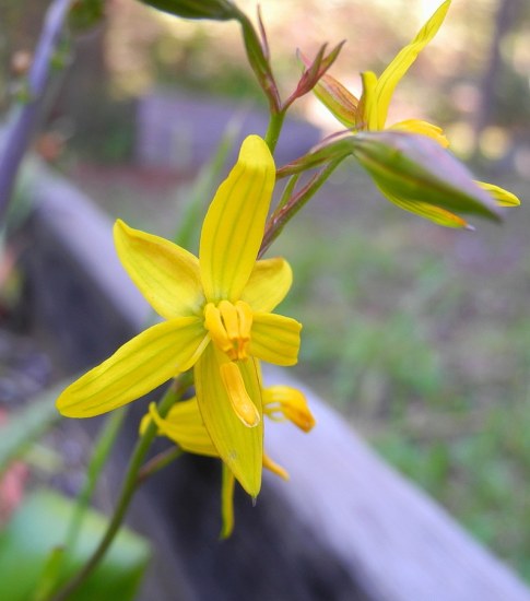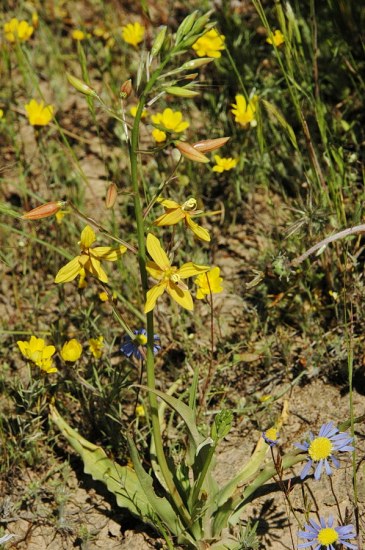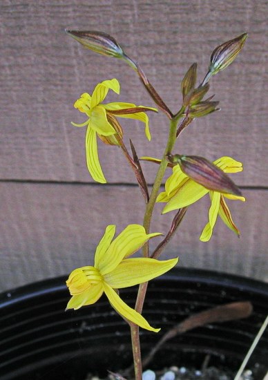 Cyanella lutea L.f. ssp. lutea is endemic to winter rainfall regions of South Africa, extending from Namaqualand, Bokkeveld Plateau and the Roggeveld, to the Cape Flats and Bredasdorp in the south and eastwards through the Little Karoo to Uitenhage. This subspecies is restricted to renosterveld shrubland on fine-grained clay soils, rarely on stony limestone flats. In Namaqualand it is also found in loamy soils. It has pale to golden yellow fragrant flowers, often flushed reddish on the reverse. Photos were taken by Mary Sue Ittner who found that her plants often spent the year underground and finally stopped coming up.
