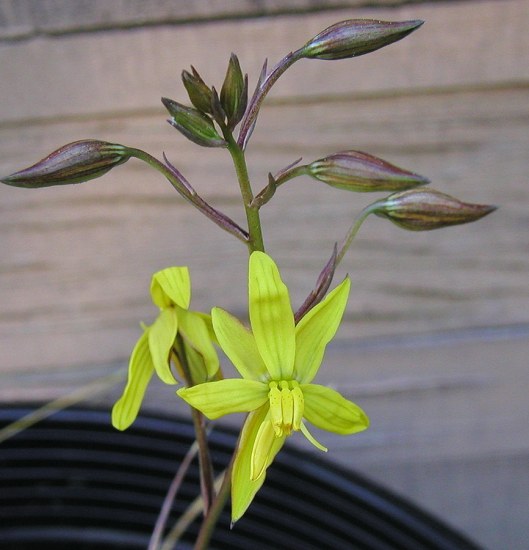 Cyanella alba Linnaeus fil. has one or two white, pink, or yellow flowers on long pedicels. Plants grow 12-25 cm high. It flowers late winter to spring and grows on stony clay and sandstone soils in dry winter rainfall areas. Flowers are solitary, usually on pedicels more than 10 cm long. This beautiful yellow form pictured first occurs in the Biedouw Valley, but is not common in cultivation. This first photo was taken at the Karoo Desert NBG in Worcester, August 2003 and the second photo was of plants grown by Jim Holmes and on display at the IBSA Bulb and Corm Symposium August 2003. Photos by Bob Rutemoeller.