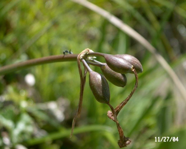 Photographs by David Pilling. Photo 1 is of Silverhill seed on a 10 mm grid in July 2008; 2 and 3 are of the first time the resulting plant bloomed in September 2013, shown in a 4" side pot; although the seed germinated easily, I lost all the plants except the one shown to frost. Photo 4 shows the bulb in October 2014 with two big offsets and some tiny ones; the ruler is marked in inches.