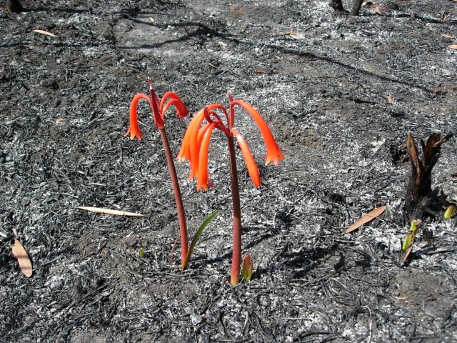 Cyrtanthus angustifolius (L.f.) Aiton is found on mountain slopes and flats in seasonal streams and marshes. It flowers spring to summer, occasionally in winter after a fire. Growing up to 45 cm, the bright red flowers are pollinated by sunbirds. The first two photos were taken in a burned area (Sandy's Glen) in the Overberg by Cameron McMaster. The third photo is from the book Plants of the Klein Karoo courtesy of Jan Vlok and Anne Lise Schutte-Vlok.