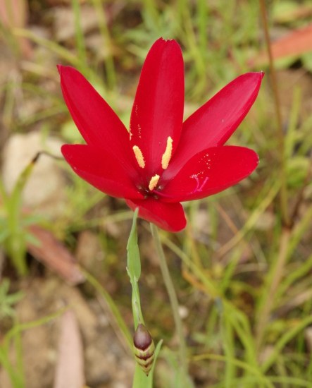 Geissorhiza hesperanthoides Schltr. grows on damp and marshy mountain slopes in the Southwest Cape and blooms late spring into summer. It is a sporadic bloomer, often blooming after a fire or when vegetation has been cleared so it has more light. It has one to three blue to violet flowers and a fibrous corm tunic, and grows 15-30 cm tall. Photo taken on Napier Mountain in the Overberg by Cameron McMaster.