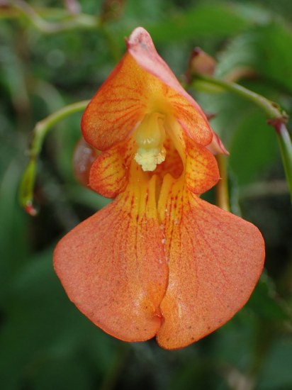 Impatiens cinnabarina Grey-Wilson is endemic to the Kimboza area, Uluguru Mountains in Tanzania at about 1000 ft (300 m). The plants grow in limestone outcrops and produce potato-shapped tubers that allow them to survive the occasional dry spells. Temperature in the area fluctuates between ~80 °F (28 °C) during the day and 60 °F (15 °C) at night. Plants can grow up to a meter (3 ft) tall with a semi-woody stem. The tubers may allow the plant to survive light frost, but it is best if the plants are kept to above 50 °F (10 °C). In cultivation this species can be grown in bright shade or filtered to good sun in cooler areas. It thrives when there is higher humidity in the air but makes a perfectly good houseplant with enough light. Grown in good light, the leaves have an almost iridescent, velvety quality. When grown from seeds, plants can make a caudex. The photos below were taken by Nhu Nguyen. Flowers in full sunlight are orange in color, but when shaded, the flowers have a cinnabar tone, true to the name.