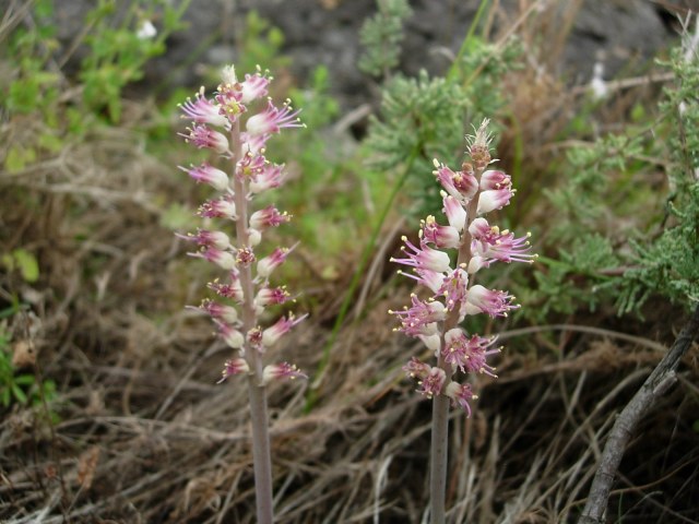 Lachenalia kliprandensis W.F. Barker is from Kliprand (southwestern Bushland) South Africa where it grows in red sand, has two ovate prostrate leaves with dark brown or green pustules on the surface and white flowers with brownish green gibbosities and pale magenta tips. Inner segments are white with broad magenta tips. This species resembles Lachenalia carnosa. Height range: 10-20 cm. The first photo is from Alan Horstmann. The second photo is from Rod Saunders. The last two photos by Mary Sue Ittner show plants grown from Silverhill Seeds.