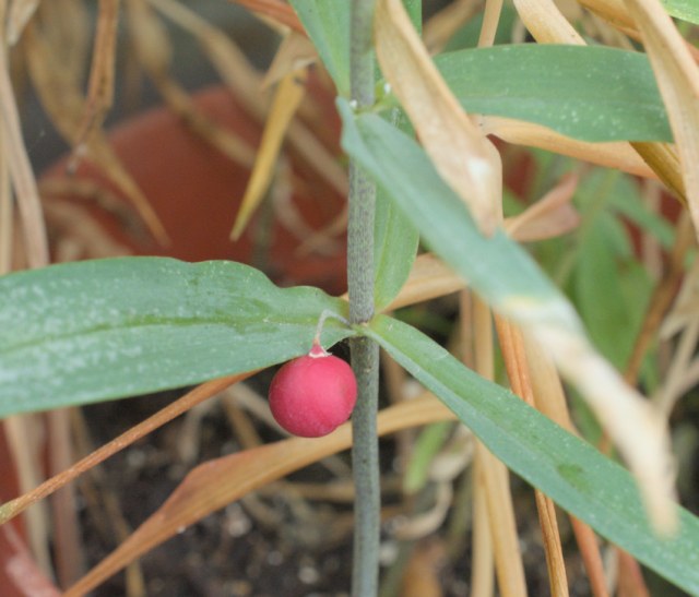 Polygonatum verticillatum (L.) All., commonly known as 'whorled Solomon's seal', is found in the north of Europe. Height range: 3-4 ft. Photographs by David Pilling: photo 1 is of seed; photo 2 taken at the end of August 2013 is of seed which started to sprout on the 14th May 2013. It appears that germination is hypogeal and the small bulbs formed will not begin to grow until 2014 after a further period of cold. Others report similar results for this genus.