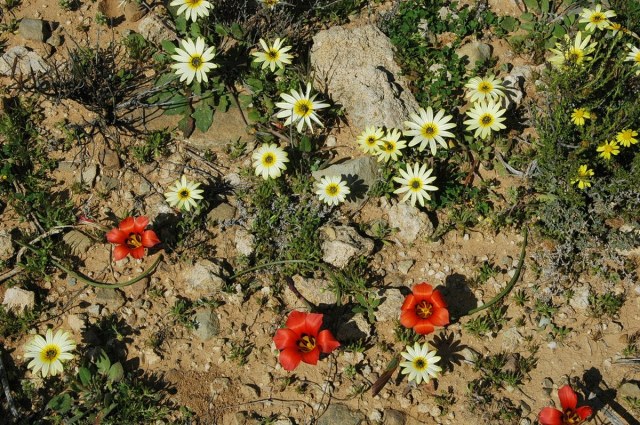 Romulea tortuosa grows in sandstone and clay soils in the inland districts of the Southwestern Cape and the western Karoo. The first and second photos from Mary Sue Ittner and Bob Rutemoeller were taken in the Komsberg and the third from Mary Sue Ittner near Middelpos. The last photo was taken by Cameron McMaster September 2011 on the Sutherland Road.