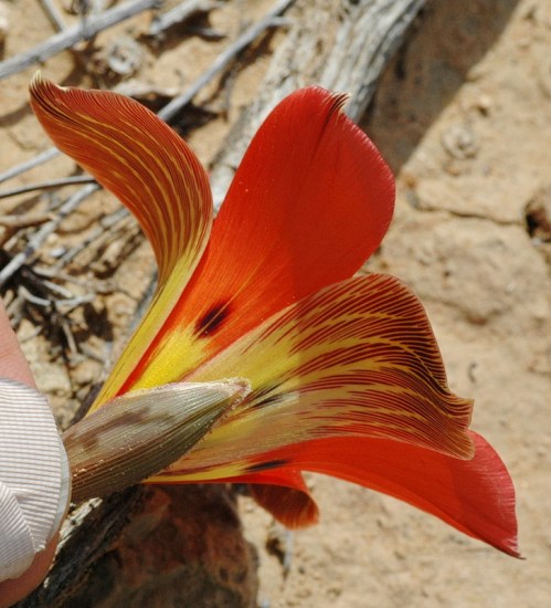 Tritonia karooica grows on dry stony clay flats in the Roggeveld and the Karoo. Photographs taken early morning September 2006 near Middelpos by Bob Rutemoeller and Mary Sue Ittner.