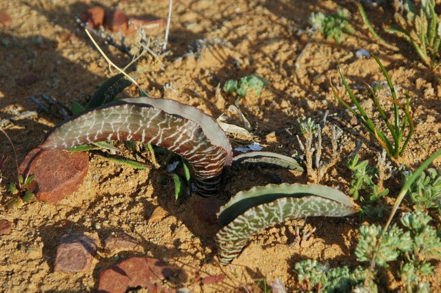 Lachenalia zebrina is found on rocky clay flats in the Western Karoo. Photographs were taken by Bob Rutemoeller and Mary Sue Ittner September 2006 near Middelpos showing the leaves as it was not yet in bloom.