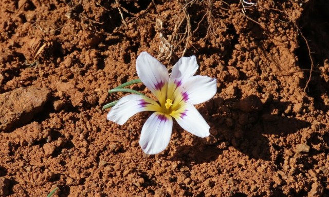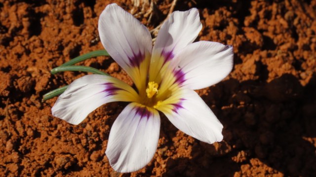 Romulea albomarginata M.P.de Vos is found on sandstone flats in the Northwest Cape, South Africa. Growing from 12 to 25 cm high, it has 3 or 4 basal and cauline leaves that are narrowly four-grooved and white or pink to magenta flowers with dark veins around an orange-yellow cup. It flowers August to October. Photo from Rod Saunders.