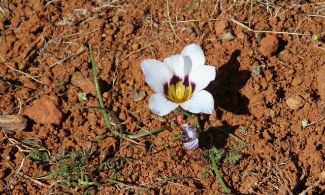 Romulea biflora(Bég.) M.P.de Vos is found on clay foothills in the Gifberg and Biedouw valley (Northwest Cape). Growing from 10 to 25 cm, it has 2 to 3 filiform basal leaves and pink to rose flowers with purple blotches around a yellow cup. Corms are obliquely flattened towards the base with a pronounced basal ridge forming an almost complete circle. Flowering occurs between July and September. Photos were taken by Rachel Saunders on the way to the Biedouw valley.