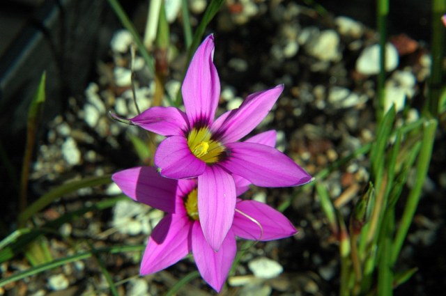 Romulea cruciata (Jacq.) Bég. is found on sandstone and granite slopes and rocks over a broad area in the winter rainfall areas. It has magenta to lilac flowers with dark blotches around the dark yellow cup and flowers July-September. Corms are pointed at the base, with straight acuminate teeth. Height: 15-25 cm. Photos by Alan Horstmann and Rod Saunders. The last photo from the book Plants of the Klein Karoo courtesy of Jan and Anne Lise Schutte-Vlok.