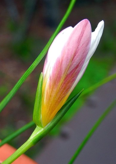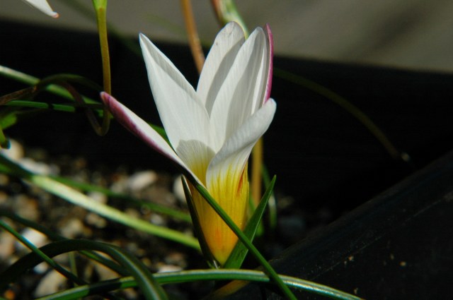 Romulea sp. This Romulea was grown from Silverhill seed called Romulea namaquensis. It was collected in Namaqualand, but does not fit the description of that species and may instead be a new unnamed species. I have had poor luck growing these no doubt because they are unhappy in my much wetter climate. Of the original 11 seeds that germinated fall 2001, only two corms have survived. One gorgeous flower bloomed in 2006. There are two basal leaves and two stem leaves. When closed the flower looked red. The flower only opened late in the day. Perhaps it wasn't warm enough although it was a period of warmer than usual weather for this time of the year. Flowers originally looked almost gold, but on later days became salmon and then orange when open with reddish lines in the throat of the flower. Photos show the stages as the flower slowly opened and on subsequent days. Photos by Mary Sue Ittner