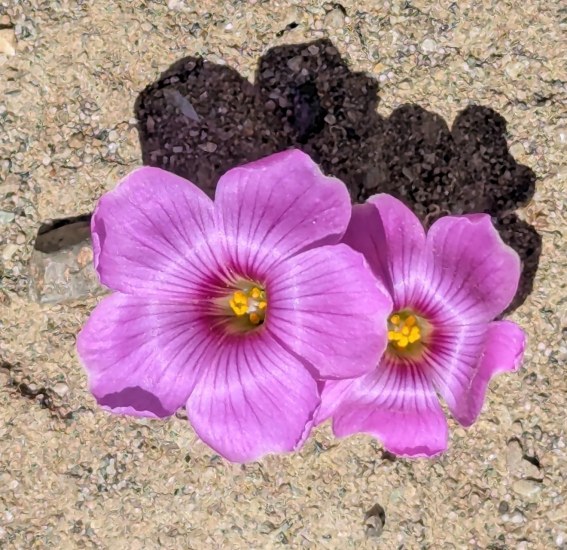 Oxalis morronei Alicia López & Múlgura grows in the shelter of rocks, in rocky and sandy soils, on slopes with a western exposure in southern Argentina (Santa Cruz, Patagonia). It belongs to Oxalis section Palmatifoliae. It grows from a subterranean rhizome composed of storage scale leaves and leaflets and has pink to violet solitary flowers. It differs from other species in this section by having square leaflets that are dented at the tip with margins that are wavy and fringed with fine hairs. More information and illustrations can be found here. Habitat photos were taken by Laura Grant in Argentina, in the vicinity of Monte Zeballos, Patagonia. She also includes a photo of the rhizome.