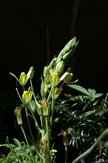 Albuca suaveolens Jacq., syn. Ornithogalum suaveolens (Jacq.) J.C.Manning & Goldblatt, is found on dry slopes and flats in a wide area including Namibia, Namaqualand and the Cape Province. It grows to 50 cm and has narrow leaves that clasp at the base and are sometimes dry at flowering. Flowers are in a stiff erect raceme, yellow, spreading or nodding, with dark green keels. Photos 1-2 were taken by Mary Sue Ittner near Calvinia. Photos 3-4 were taken by Cameron McMaster in Elands Bay and Namaqualand. Photo 5 is a close-up of a flower in cultivation taken by Alan Horstmann.