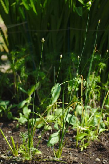 Allium scorodoprasum L. is a European species with bulbils and is therefore to be avoided. It has purple flowers on unequal stalks.