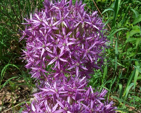 Allium 'Globemaster' is a fantastic cross (Allium macleanii x cristophii) made by Jan Bijl, requiring nearly 20 years to bring it into commercially scaled production. It has dense globes of purple starry flowers that have that same metallic sheen evidenced by Allium cristophii (often misspelled "christophii"). The floral globes start out 4-5" across, but since the new buds pop out just beyond the spent blooms, the great spheres of bloom grow in size over several weeks. Under good conditions, the bloom heads can exceed 11" (28 cm) across! One of the best features of the "big ball" type of alliums are the fantastic seed heads. In the second photo taken 3/6/03 there are two dried 'Globemaster' seed heads. The dried seed structures are about 8 years old now, but still hold their decorative appeal. Photographed up against a brick wall, and knowing that a brick is 8" (20 cm) wide, you'll get a good idea just how huge the bloom heads can get. Photos by Mark McDonough.