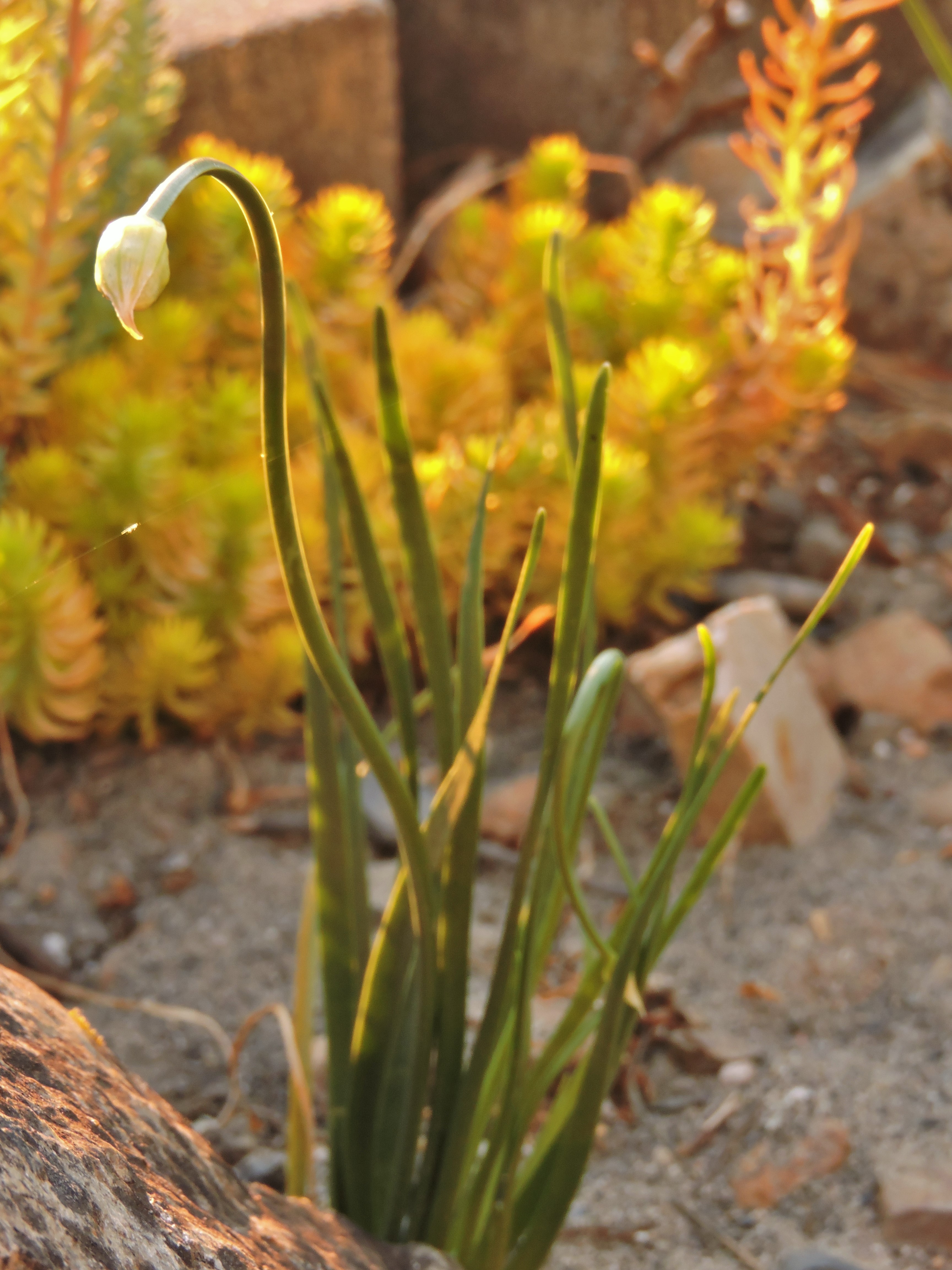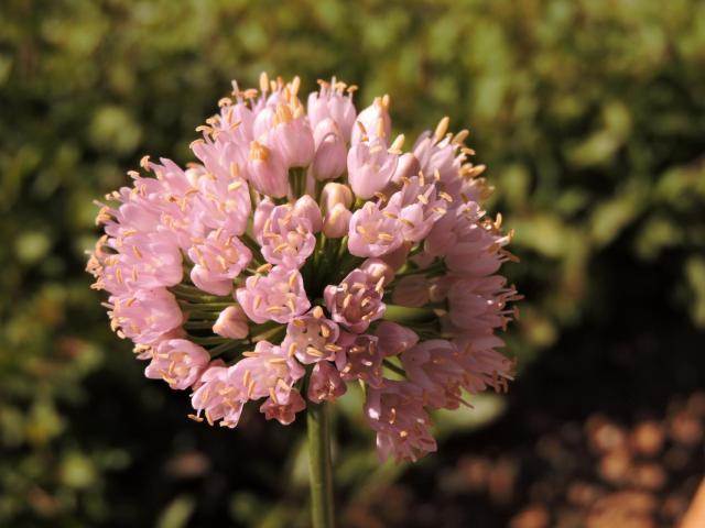 Allium 'Sugar Melt' was bred by Mark McDonough. It is a rhizomatous hybrid between Allium nutans and Allium senescens. It grows to roughly 12" and flowers late summer to autumn. The plants like moist conditions that do not dry out too much in the summer. From Mark McDonough: "It's an Allium senescens glaucum, green foliage instead of gray, taller (but still compact), and bountiful hemispheres of pink with yellow stamens, and of course rather late blooming."