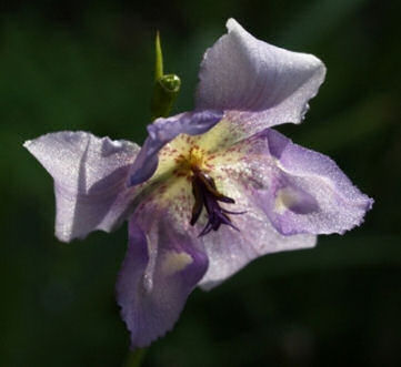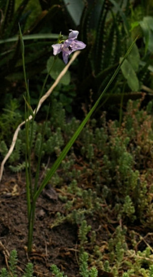 Alophia drummondii (Graham) R.C.Foster or the pine woods lily grows in moist sandy soils in grasslands and open pine woods in the southern United States south to Mexico. Temperatures tend to be very hot and humid in the summer, with relatively lower amount of rain in the winter and almost no frost. It has violet-maroon flowers with brown, yellow, and white markings and blooms in summer. It can be grown from seed to flowering in one to two years. Height: about 30 cm. Photo #1 by Mary Sue Ittner. And blooming on another day, photos 2-4 by Bob Rutemoeller showing the front and the back and a very unusual view of the side. Photo 5 by M. Gastil-Buhl shows seed from PBS BX 323 #25 on a 1 mm grid.