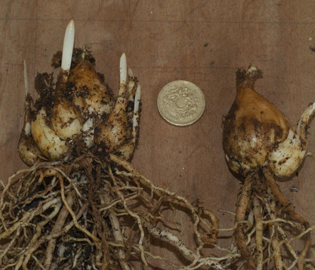 Photographs by David Pilling with the first one of (less than flowering size) bulbs four years after the seed was sown (the coin is about an inch in diameter) and the second showing a flower emerging. Photos 3 and 4 are of commercially supplied bulbs of the white variety on a 10 mm grid.