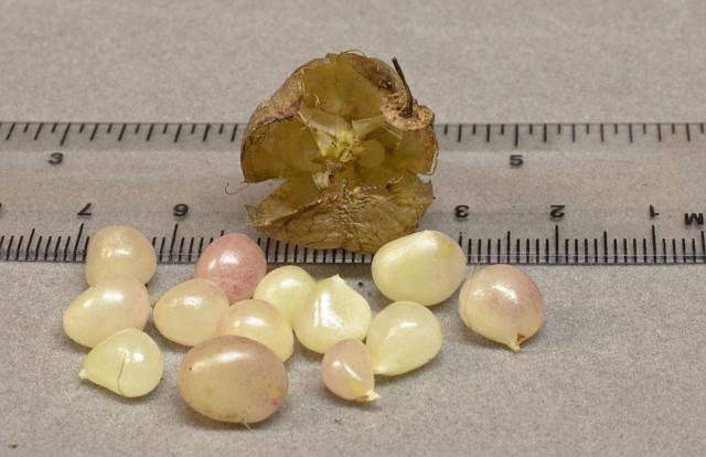 In 2014, there were four flower stems. I cross pollinated the flowers by hand; for a long time I thought this had failed; but eventually I became convinced there were seed pods and after more time this proved correct. In other words seed development is slow. The photos below show the time line; hover over them to see the dates; in total 11 weeks from flower stem appearing to seed.