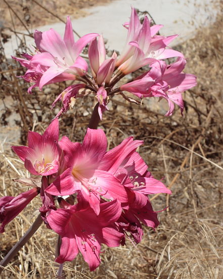 MBQ 01 is an Amaryllis hybrid from Richard Doutt's old Bio Quest International mail order nursery, purchased from him in the early 1990s. It blooms reliably, at the end of summer. It's very vigorous, has a good bud count, strongly radial form, makes offsets regularly, and has large, reasonably dark pink flowers (they start pink and white, and then age to more or less solid pink). Unlike some other dark pink Amaryllis hybrids, these are pure clear magenta, with no mauve overtones. Photos by Michael Mace.