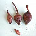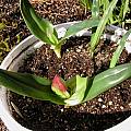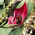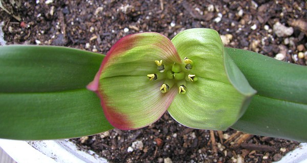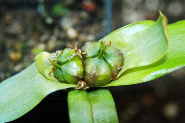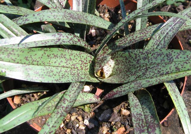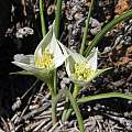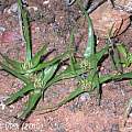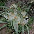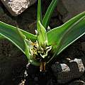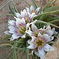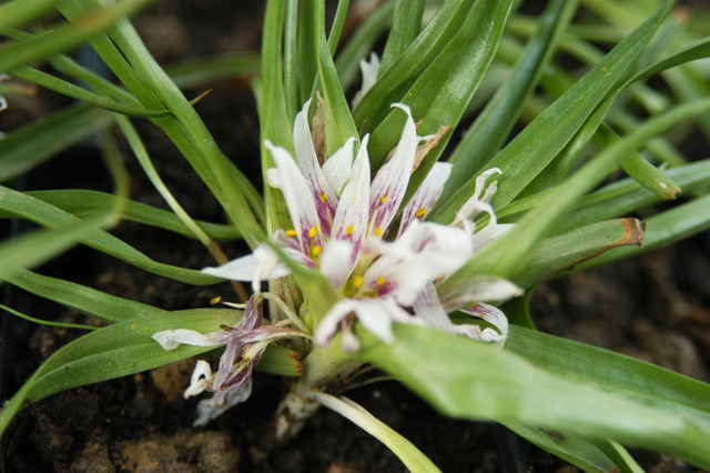 These photos by Mary Sue Ittner show plants grown from seed and blooming in Northern California for the first time in December 2003. There are three views, one of the plants in a pot, one looking down on the flowers, and the third a close-up showing the bracts and the stamens. It most closely resembles what was Androcymbium latifolium in the key in The Color Encyclopedia of Cape Bulbs but Julian Slade thinks it may be a hybrid with it and another species. A final photo taken when dormant shows the corms. This plant has not done well in the wet humid coastal Northern California winters.