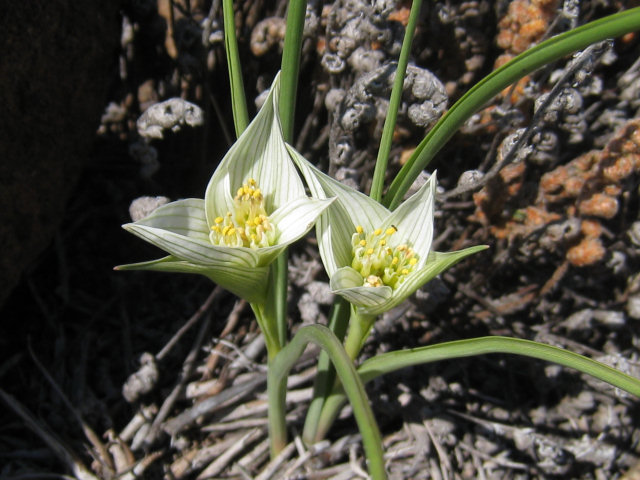 Colchicum striatum (Hochst. ex A.Rich.) J.C.Manning & Vinn., syn. Androcymbium striatum Hochst. ex A.Rich., is found on damp ground among rocks and gravel patches from 1800-3000 meters from the Eastern Cape, South Africa to Tropical Africa. Leaves are slender and keeled and flowerheads are hidden within large white petal-like bracts striped with green or violet. Height: to about 35 cm. The first two photos by Cameron McMaster were taken in the Eastern Cape, South Africa. The third photo was taken on a rainy day in January by Bob Rutemoeller. The last two photos were taken at Andriesberg.