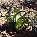 Colchicum volutare (Burch.) J.C.Manning & Vinn., syn. Androcymbium volutare Burch., is found in gravelly clay in karroid scrub from the western Karoo to Little Karoo. It has several narrow leaves that are coiled. Flowers are enclosed in a pair of pale green upright bracts with coiled tips. Height range: 15-30 cm. The first two photos were taken by Bob Rutemoeller and Mary Sue Ittner in Calvinia September 2006. The third photo was taken by Cameron McMaster September 2011 near Middelpos. The last photo from the book Plants of the Klein Karoo courtesy of Jan and Anne Lise Schutte-Vlok.