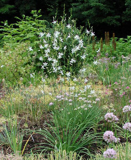 Anthericum liliago L. is native to Southern Europe where it is found in mountain meadows. It has grass-like leaves and white flowers. These pictures were taken May 2004 at Kew Gardens by Bob Rutemoeller. This species is often received as seed under the name Paradisea liliastrum, a more desirable but less amenable garden subject that has funnel-shaped flowers rather than the widely flaring flowers of Anthericum. This and other Anthericum species are likely to self-sow prolifically in the garden. Height range: 45-60 cm. Photos 1-2 were taken by Bob Rutemoeller. Photo 3 was taken by Nhu Nguyen from the UC Botanical Garden.