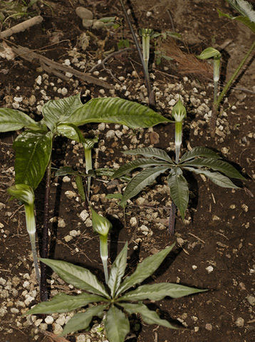 Arisaema barnesii C.E.C.Fisch. is a medium plant with a plain green leaf divided into 3 to 7 leaflets. The spathe, green with broad white stripes, displays at the leaf level. Height range: 30-60 cm. Photos by Giorgio Pozzi. In the first taken September 2006 the plants are growing in a pot; in the second taken July 2007 in the woods. The plants are taller than they were in the past year.