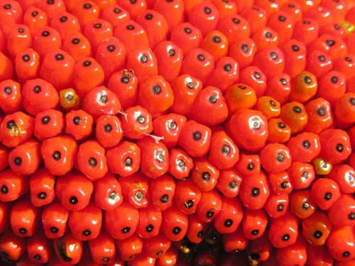 Arisaema amurense Maxim. is a widespread and diverse species from Asia, China, and Korea. The name "amurense" encompasses a variety of synonyms and variants. Typically the flowers are green striped with white, or brownish green or even dull purplish green, again with white stripes. The flowers are held on short stalks below or mingling with the foliage. Here are two photos taken in September showing the fruit cones. The first shows early fruiting, the "berries" still green, with some of them turning orange. The second view shows the brilliant orange fruits fully exposed as the foliage has withered away. The dangling cluster of showy pinkish-red berries is Maianthemum racemosum, syn. Smilacina racemosa, or False Soloman's Seal, a native liliaceous plant here in North America. Height range: 30-50 cm. Photos by Mark McDonough taken September 2005.