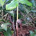 Arisaema exappendiculatum H.Hara is a tall species (up to 1.2 m) similar to A. concinnum with indistinguishable leaves and a green or purple inflorescence. The spathe hasn't a visible spadix appendage. This absence gives the name to this species. The margins of the spathe's limbs are overlapped, hiding the male or female spadix. The plant produces stolons each year that extend up to 50 cm from the tuber and a rich clump is formed in a short time. The first picture shows the plant while the spathe is still unfolding, the second picture shows the leaves, and the third shows the spathes unfolding one week later. Photos by Giorgio Pozzi, May 2008.