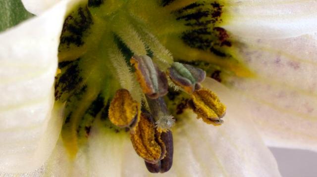 Fritillaria forbesii Baker is a moderately tall (c. 12 in/30 cm) species from southwestern Turkey. The flowers are similar to those of Fritillaria carica and other species of the region (and to American Fritillaria pudica) but it is distinguished by its narrow, alternate stem leaves and lack of basal leaves. Grown from seed purchased from Archibalds, and flowering in a bulb frame in Oregon in March. Photo by Jane McGary