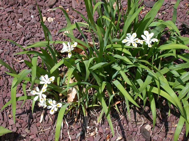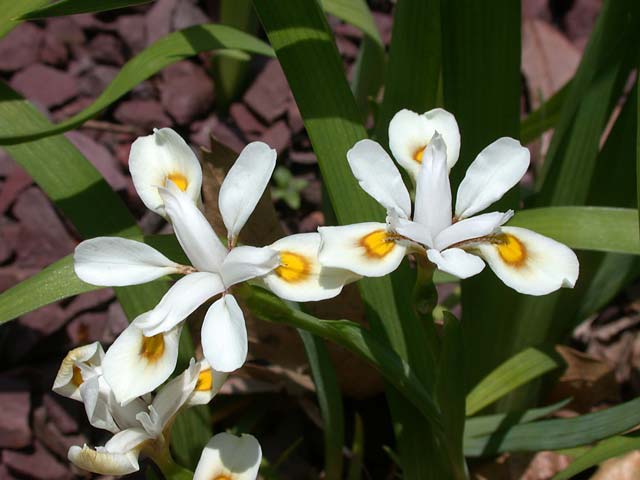 Iris odaesanensis Y.N.Lee is among several exciting Korean species suitable for a partly shaded woodland situation, but will take about 6 hours of sun as well. Height: to about 20 cm. The first three photos were photographed by Mark McDonough in Darrell Probst's fabulous Epimedium nursery known as Garden Vision. Darrell has several forms; all are beautiful, looking somewhat like a large white Iris cristata with a mass of pure white flowers and distinct yellow signals. In the last of these three photos, notice the one aberrant fused flower. The final three photos were taken by John Lonsdale.