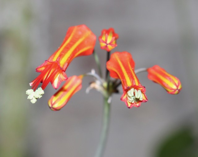 Behria tenuiflora Greene (syn. Bessera tenuiflora (Greene) J.F.Macbr.) is a beautiful and vivid wildflower endemic to the southern part of the Baja California peninsula, Mexico. The wild populations are distributed in an altitudinal range from the top of the mountains at 2200 m to practically sea level. It has remained exceedingly rare in cultivation. The flowers appear as early as August, but more typically in Sept-Oct. and are especially striking up close with a combination of orange-red ground color, yellow stripes and green pollen. As with most of western Mexico, the Cape region of Baja California is subject to summer monsoon rains and this provides clues as to how to handle this species in cultivation. Dylan Hannon has found this to be an unpredictable plant that may not sprout until very late (Aug-Sept), long after its cousins like Milla and Bessera are well along in growth or flowering. Corresponding to this late emergence, the leaves of Behria can remain green well into winter and seem to enjoy the cool down. In a given year some or all of the corms may not sprout at all. Height range: to about 30 cm. The photo below shows pictures from a plant originally collected by Myron Kimnach, MK 3158, grown and photographed by Dylan Hannon.