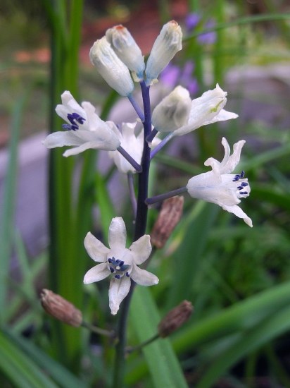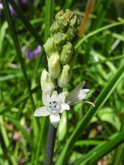 Bellevalia flexuosa Boiss. is a winter grower distributed in the Middle East and North Africa where it grows in Mediterranean woodlands and shrublands and semi-steppe shrublands. Known as Common Roman Squill, it grows to about 10 cm (4 inches) tall and flowers January to March. The creamy white flowers are not especially showy, but have purple/blue stamens. In the same population there may be individuals with a green scape or a purple-topped scape. There is a flower mimicry between this bellevalia and Orchis israelitica so bees visiting this species will also visit and pollinize the non-rewarding orchis. In the garden it will often self-seed, so might have weed potential in favorable climates. Bellevalia flexuosa has been studied for its cytotoxic compounds against certain cancers. To learn about this see this article. The first three photos from Shmuel Silinsky. Photo 4 taken late January 2010 by Shlomit Heymann in Israel.