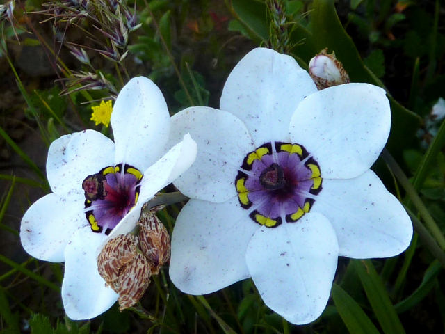 Sparaxis tricolor seen flowering in Nieuwoudtville September 2006. Photos 1-3 taken by Mary Sue Ittner and Bob Rutemoeller including a close-up with a beetle pollinator and the last shown with Lapeirousia jacquinii. Photo 4 was taken by Cameron McMaster at the Biekoes Farm near Nieuwoudtville September 2011.
