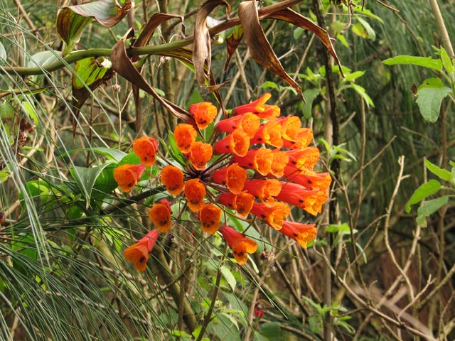 Bomarea acutifolia (Link & Otto) Penny a species from Mexico and Costa Rica, is probably not as hardy as the others. However, in good growing conditions it can be very vigorous, growing into trees as seen below. Photos 1-2 were taken by Susan Hayek of a plant grown by Diana Chapman of Telos Rare Bulbs. Photos 3-5 by Nhu Nguyen show an inflorescence and the vigorous habit of this species. At the Strybing Arboretum where these photos were taken, the very large clump has climbed into a Mexican weeping pine (Pinus patula) mimicking how these plants might grow in habitat.