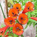 Bomarea patacoensis Herb. is from Colombia and Peru. The outer petals are scarlet with inner petals that open yellow and turn to deep red spotted heavily with darker red. It grows 8-12 ft. Grown by Diana Chapman of Telos Rare Bulbs and photographed by Susan Hayek.