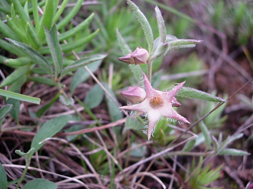 Brachystelma caffrum (Schltr.) N.E.Br., syn. of Ceropegia caffra (Schltr.) Bruyns, is found in the Eastern Cape, South Africa, growing in rock crevices on flat dolerite outcrops. It is rare and localised and listed as a threatened Red Data Species. Height: to 12 cm. Photo by Cameron McMaster