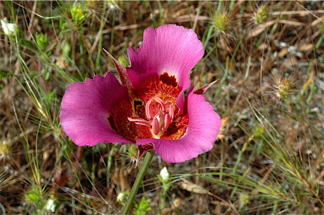 "The next destination in my season of Calochortus pursuits was a very special population of Calochortus venustus in the central Sierra foothills. On drives in the foothills from Copperopolis to Camp Nelson, you can find mostly white C. venustus populations intermixed with variant individuals of deeper pink, red and fuchsia tones. The rarest of these color variants have brilliant petals fully painted inside and out with deep shades from magenta to rust. These flowers were some of the highlights of my season."