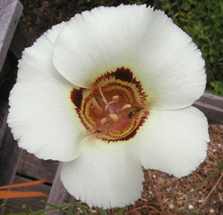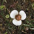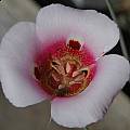 Calochortus venustus Douglas ex Benth., the most variable Calochortus species in terms of color, is found in both the California coast ranges and the Sierra Nevada. It is found in open grassland and in mountain meadows at elevations ranging from sea level to 8,000 feet (2600 m). Color ranges from various shades of red to white, yellow, orange, and purple. The petals are often blotched midway, with another paler blotch on top. The nectary is more or less square and densely covered with angled hairs. This species was featured in Mariposa,Volume 2,#3. Because C. venustus has a very broad range, it's hard to generalize about how to grow it. The seeds of high-altitude varieties will require cold stratification in order to sprout (the most colorful forms generally grow at higher altitudes) and may be adapted to grow after the snow melts in spring. Low-altitude varieties may need protection from heavy frosts, and are likely to grow in winter. Height range: 1-2 ft. All forms need to be kept dry after they go dormant until the rains start in fall (usually October-November). There are some very nice color forms shown in the CalPhotos database here.