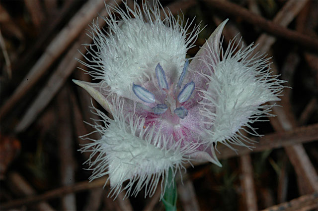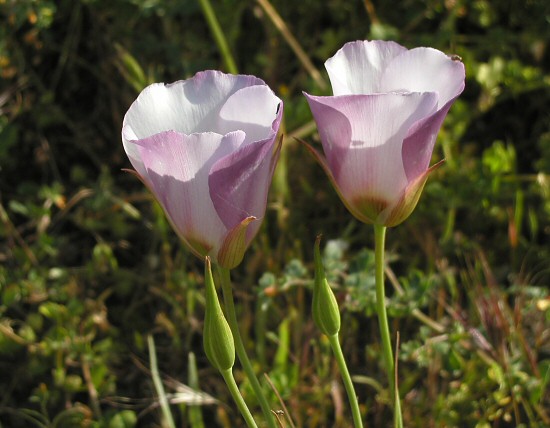 Calochortus catalinae S.Watson is found in grassy places near the coast from southern California to Baja, growing to about 60 cm high. The flowers are large, white to lilac, usually with a purple spot at the base of each petal. Petals are naked except for a few slender hairs near the base. This species was featured in Mariposa,Volume 13,#4. This species was seen April 2005 growing on Figueroa Mountain in Santa Barbara county in grassy areas along with Lupinus sp., Delphinium parryi and Dipterostemon capitatus (syn. Dichelostemma capitatum). These in situ photos were taken there by Mary Sue Ittner.