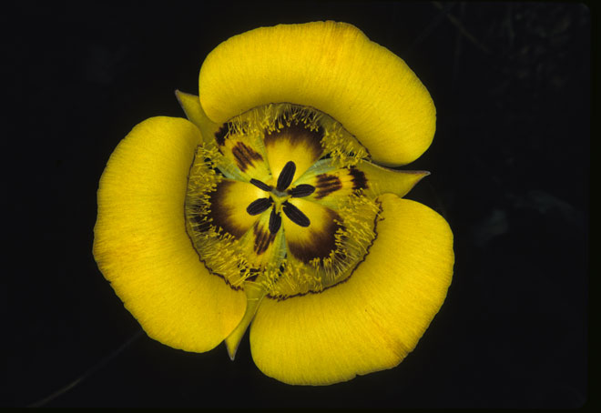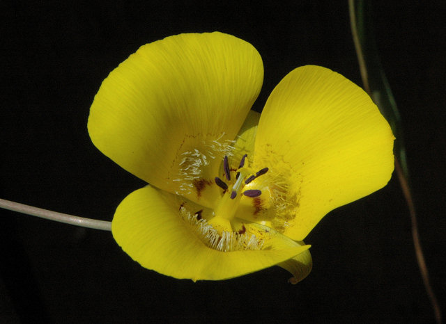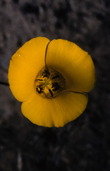 Calochortus concolor (Baker) Purdy & L.H.Bailey is a golden species with erect, commonly branched stems 20-60 cm, that can carry one to eight bowl-shaped flowers. This species is found from the San Bernardino Mountains of California, south to the north Sierra Juarez in northern Baja Mexico. It grows in grasslands, chaparral, edges of coniferous forest, and in the desert mountains amongst the grasses, sagebrush, cacti and agave, elevations 600-2600 m. Photo #1 was taken by Ron Parsons, Riverside County, California. Photo 2 was taken by Jim Duggan. Photo 3 taken by Nhu Nguyen shows a bulb.