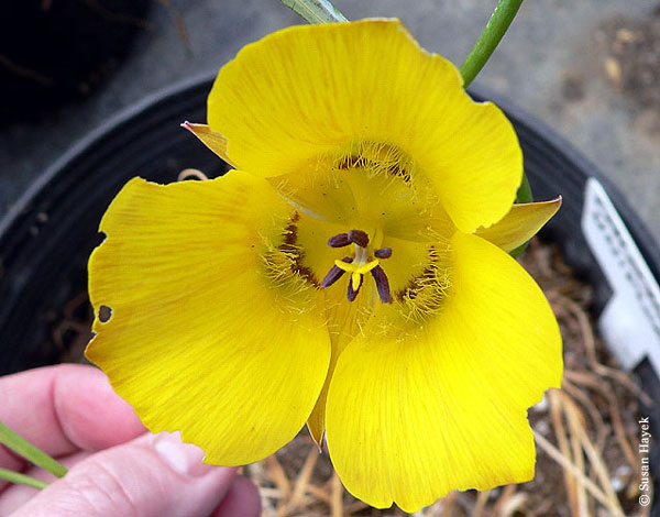 Calochortus coxii M.R.Godfrey & Callahan is endemic to one ridge complex south of Roseburg and north of Myrtle Creek in Oregon. A short-stemmed plant (30 cm) with flowers that remain cup-shaped, it inhabits ultramafic (serpentine) soils in nature, but despite Callahan's (2001:113) suggestion that Epsom salts be added to its soil, the pictured plants are growing well without this amendment, in a bulb frame in northern Oregon. This species was featured in Mariposa,Volume 12,#1. The first two photos by Jane McGary. Numbers three and four shown below were taken at the site of the type collection, June 2007 by Mary Gerritsen