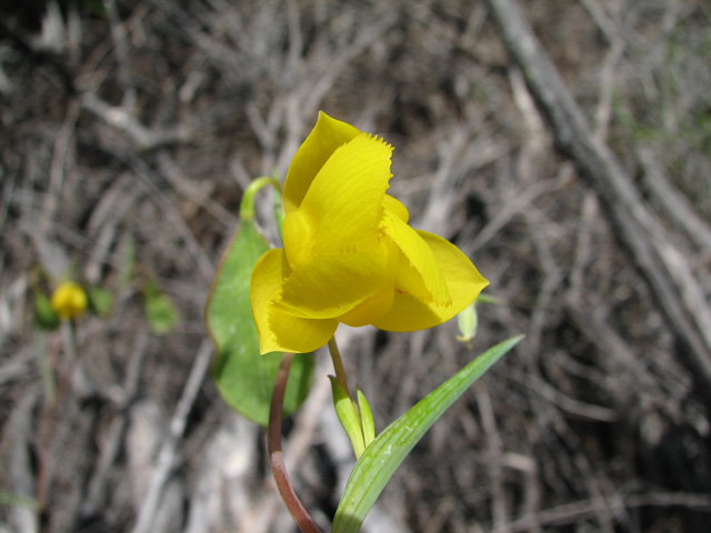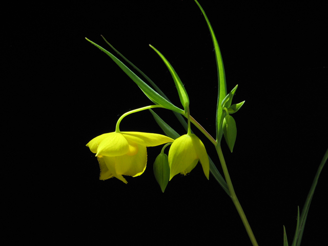 Calochortus amabilis Purdy is found on open hillsides and in open woodlands in the Coast Ranges of California. Height range: 3-20 cm. This species was featured in Mariposa,Volume 4,#4. It has yellow globe flowers and is known as Diogenes' Lantern. Its closest relative is the more robust Calochortus pulchellus which is endemic to Mount Diablo with greenish bracts. The bracts on Calochortus amabilis are pure yellow. The Jepson Herbarium Calochortus key describes the leaves of Calochortus pulchellus as green and those of Calochortus amabilis as more or less glaucous. This species can be grown in semi-shade or full sun. In full sun, sometimes the leaves take on a purplish appearance. Except for sunlight, treat this species the same as Calochortus albus.