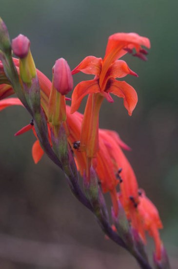 Chasmanthe aethiopica (L.) N.E.Br. is found mostly in the winter rainfall zone of South Africa from the Western Cape along the southern coast to the Eastern Cape. Plants grow in coastal bush and along forest margins. This species is shorter than some of the others with a spike that is seldom more than 20 inches (50 cm). The bright orange to scarlet flowers with a yellow tube on the underside are on an unbranched stem that is inclined horizontally. The flowers face to one side. The orange seeds are fleshy when first exposed. Height: to about 3 feet (90 cm). The first two photos by Cameron McMaster were taken in Napier in the Overberg and the second two were taken of a form found in the Eastern Cape. The last two photos were taken by Christopher Whitehouse in the Phillipskop Mountain Reserve near Stanford.